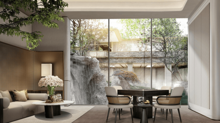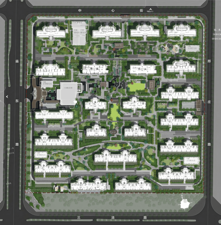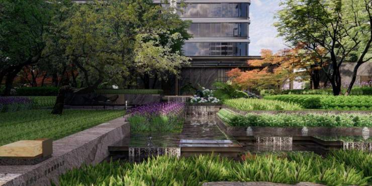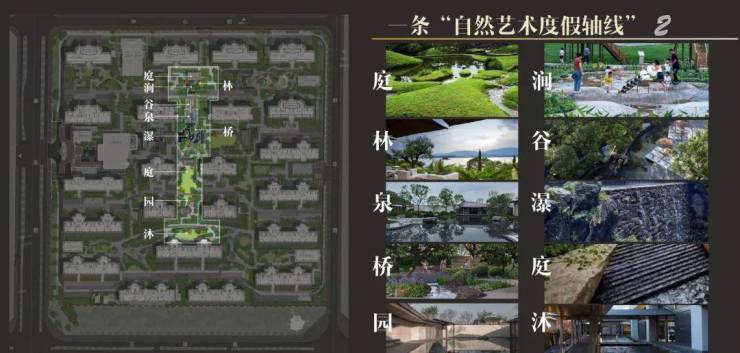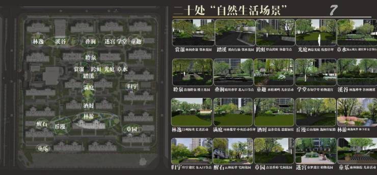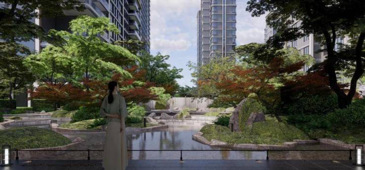 在小区内部的景观规划上,亮点多到眼花缭乱不知道从哪开始聊。中轴线上就有庭、涧、林、谷、泉,桥、瀑、庭、院、沐的十处自然山水场景,景观多到目不暇接。