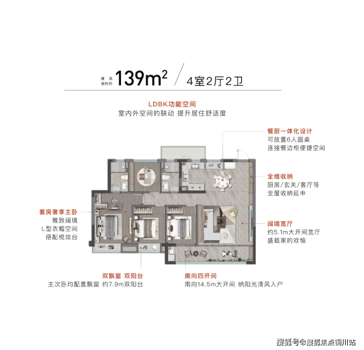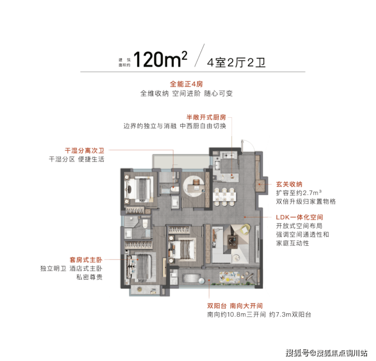 新奢生活观&新奢人居观: 恒温泳池、行政酒廊、活力健身房、漂浮瑜伽室等组成的架空层泛会所,重构了社区社交与健康生活场景;而建面约120㎡正四房“会成长的家”,则以极致的空间格局和生长性,解决了全龄段家庭的核心痛点与情感需求。