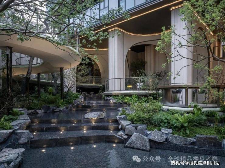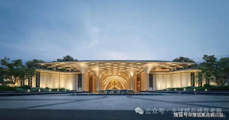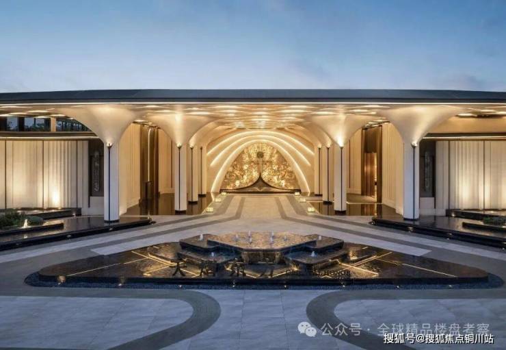 约44米玉阙迎辉主入口,结合潘多拉奢石与红果冬青,营造归家仪式感,"八方来仪"殿堂式立柱拔地而起,弧线向上尽显望族门风永续,站在门口就能感受到扑面而来的豪门气场。