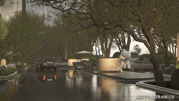 将自然主义与东方哲学相融,以“水”为脉,四水归堂,叠山理水,构筑六大主题区,通过五大景观元素,形成 “九景共生” 的悬浮游园体验。