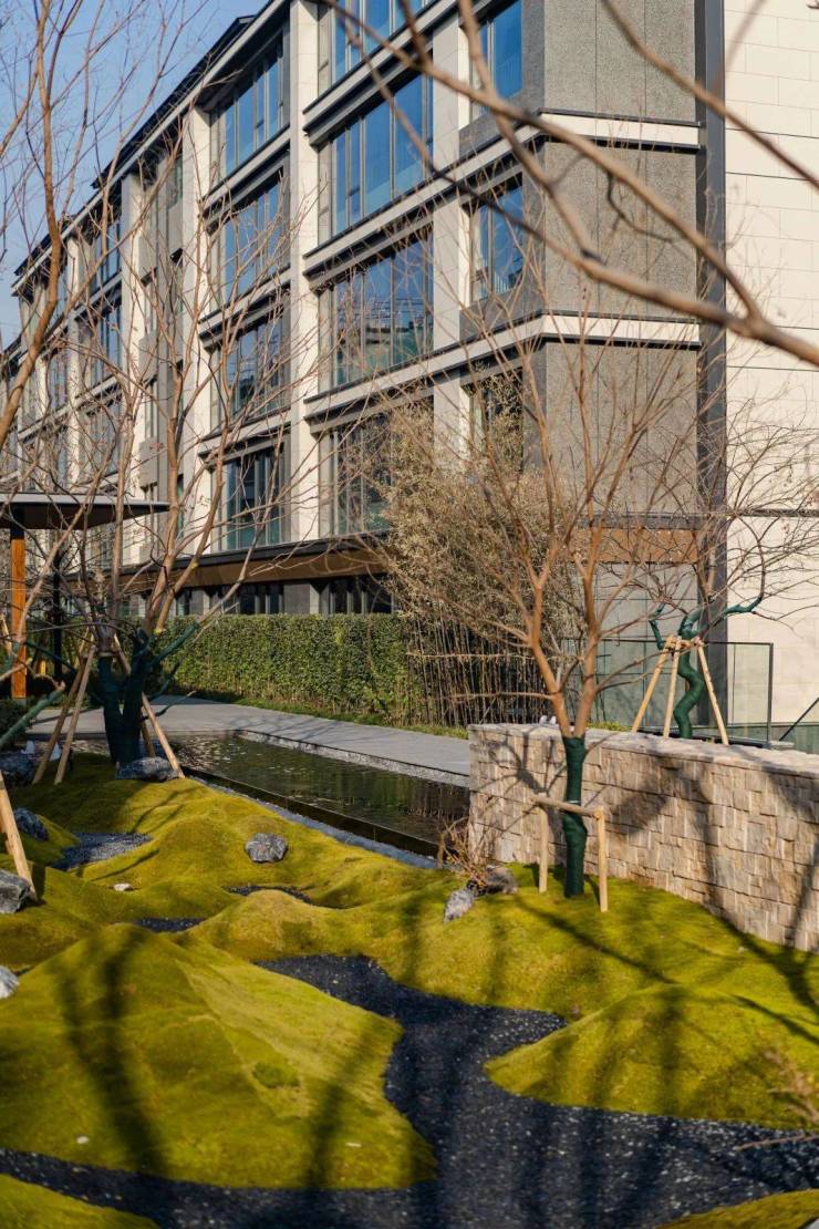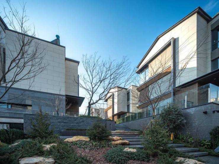 社区园林景观设计独具匠心,以 “凌青山 伏幽谷” 为整体布局规划,将建筑依山而建 。入口落客庭院以原山石的大块布局,一株乌桕树与石相契,枝繁叶茂,为业主营造出宁静而又温馨的归家氛围。一路前行,崖石溪涧分布两侧,山居、自然、植物互相交融,浑然一体。倾泻而下的景观瀑布,利用天然的山体高差打造,溪水潺潺流淌,与建筑、山石、树木自然地结合在一起 。业主站在观瀑平台眺望,能在激荡的水瀑和茂密的山林中体悟与山无界的状态。社区内还种植了大量的天然林木,直立挺拔的杉树林与河桦林撑起山的气势,墨西哥落羽杉、源自于北美密西西比河沿岸的河桦树种等,为社区增添了更多野趣 。前庭院地面小块砖选用来自福鼎黑小料石,通过匠人师傅手工敲制而成,再逐一铺设,彰显出品质与细节。示范区内的高湖石,全部产自于仙都风景区,其厚重的白灰色调与自然流畅的肌理相得益彰,赋予极致的视觉享受。