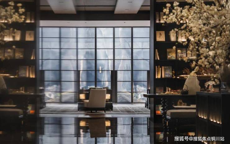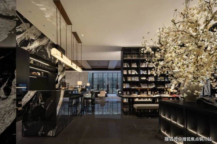 书吧区域是整体以书柜造型围绕出一个半封闭的体块,结合茶吧的功能在一进入会所时就先传递出一份茶香书香。沧海龙吟石材和深灰色木饰面结合,点缀以大型纯白色插花和软装。光与色的交织,绘就出一幅融汇古今的生活画卷。