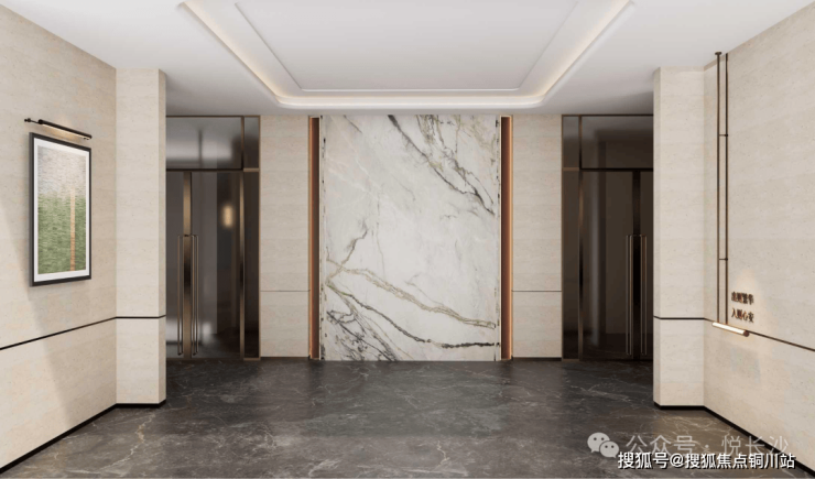 此外,项目二期高层区域还打造了高品质架空层,以卡拉卡塔·莫奈大理石为背景,石材与金属线条勾勒软装的层次。