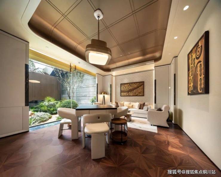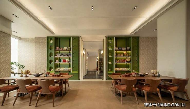 独立于生活馆主楼的茶室,位于下沉庭院侧面,空间相对私密。整体亦采用与洽谈区一致的暖白色调,而红棕色木地板又增添几分雅致与温馨。大面积落地窗的运用为宾客呈现一幅全新视角的庭院风景画。