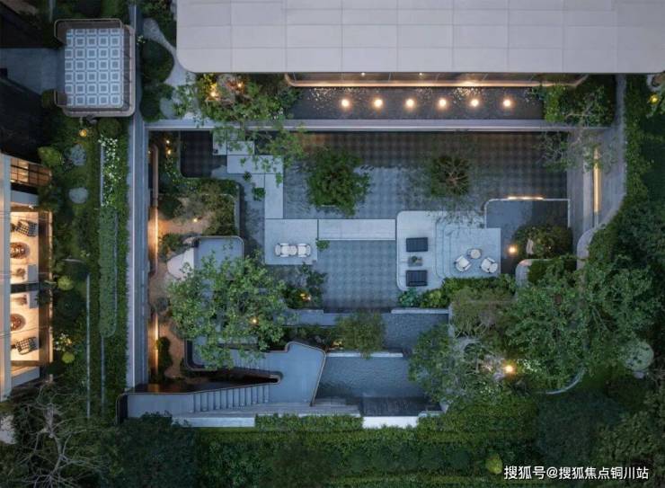 相对应的,丽香庭主入口遵循传统对称美学,采用现代工艺与材质营造奢华感;通过多重庭院,形成仪式感归家院落。同时,打破规整的水平空间布局,利用地势高差对空间进行重组、叠合,形成自由灵动的立体庭院;让人们在曲径通幽的游园路径中回归自然,抵达精神心乡。