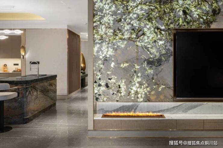入户大堂的墙面、地面、背景墙,目之所及,都是大自然的瑰宝,“星际灰、依云灰、香格里拉翡翠”;入户大堂的吧台、电梯里的中间屏风,镶嵌的是“普拉达绿”奢石;约517平户型,入户玄关与客厅背景墙,两面“孔雀开屏”奢石,造价80万;岛台台面,类翡翠玉石,造价50万。