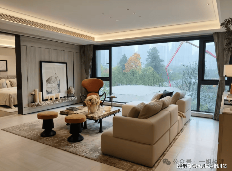 来看样板间,客厅以及南向卧室均是全落地窗,建面约143平的客厅空间感比较常规。