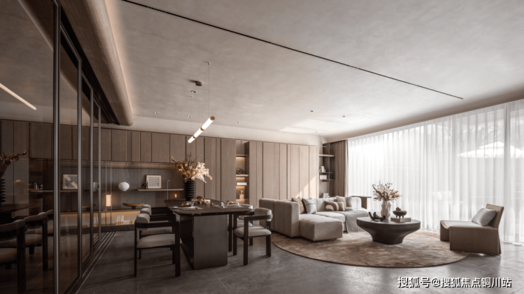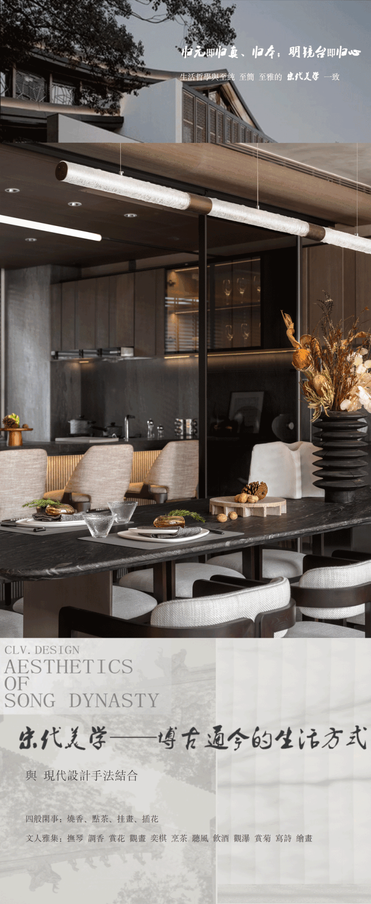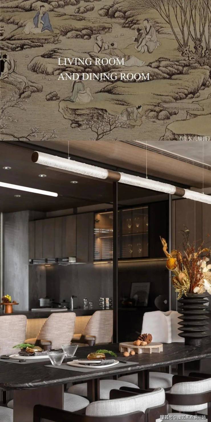 如今被时代的巨轮裹挟着前进的生活,看似快捷便利,而人们内心依然在乎山水之间,对于诗意栖居的情怀与追求,从未比古人少。户型空间内,客餐厅打造以曲水流觞为主题,以水为灵感打造客餐厅的静谧之感。