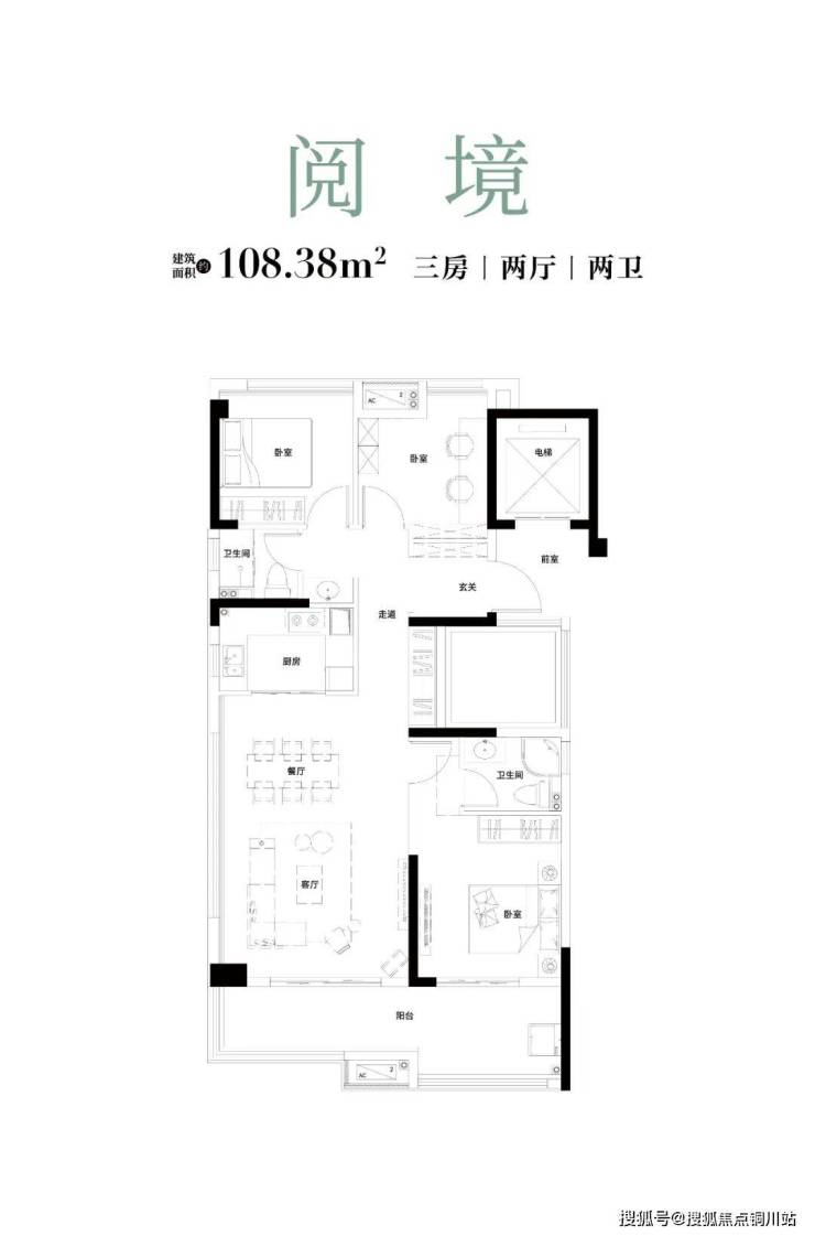 建面约108平 三房两厅两卫: