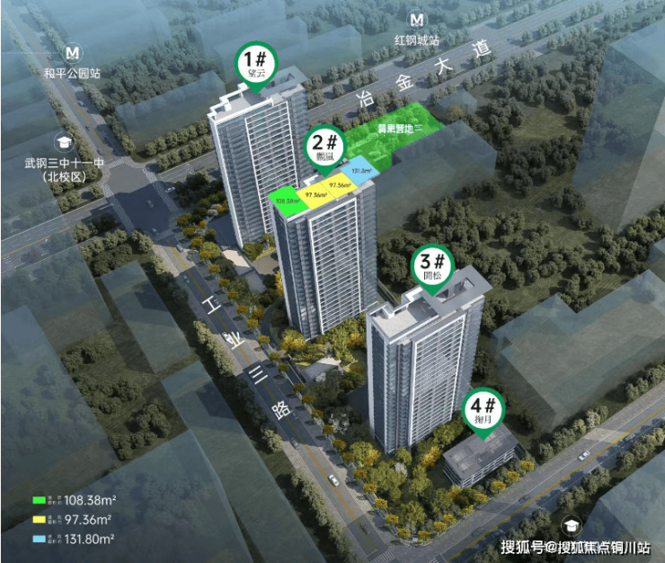 2号楼为27层的高层住宅,一个单元,三梯四户结构,分布户型为建面约97-132平三房四房。