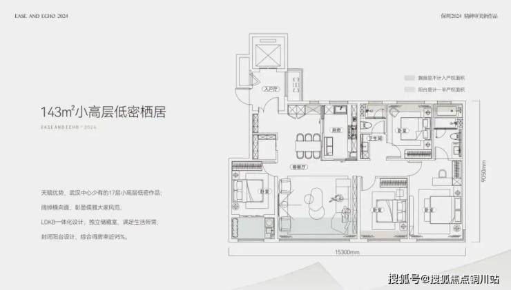 143㎡属于小高层户型,四房两厅两卫,南向面宽高达15米;并且还是四开间朝南,客厅开间约5米;阳台进深约2米,双阳台再加上全赠送的飘窗,优化后得房率约95%,如果再加上约6.6㎡的电梯前室,最终得房率高达99%。