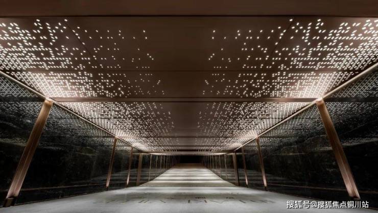顶面的铝板铺装,两侧的奢石岩板,水磨石地面镶嵌全区域铜制归家标识,一眼震撼,尊贵感油然而生。
