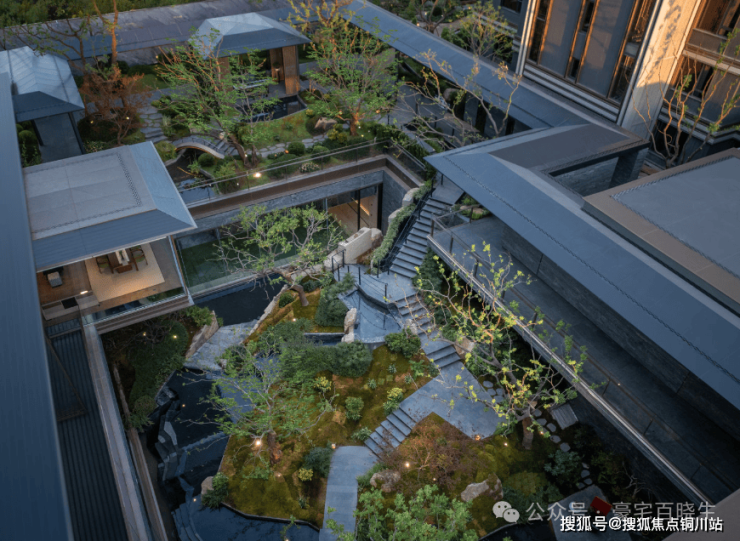 这条绿轴自南向北延伸,以近百平米的镜面水景为起点,溪流蜿蜒,小桥点缀,既保持了建筑组团间的独立性,又通过水声、光影的流动让整个社区和谐共生,营造一种“和而不同、独立共生”的意境和美感。