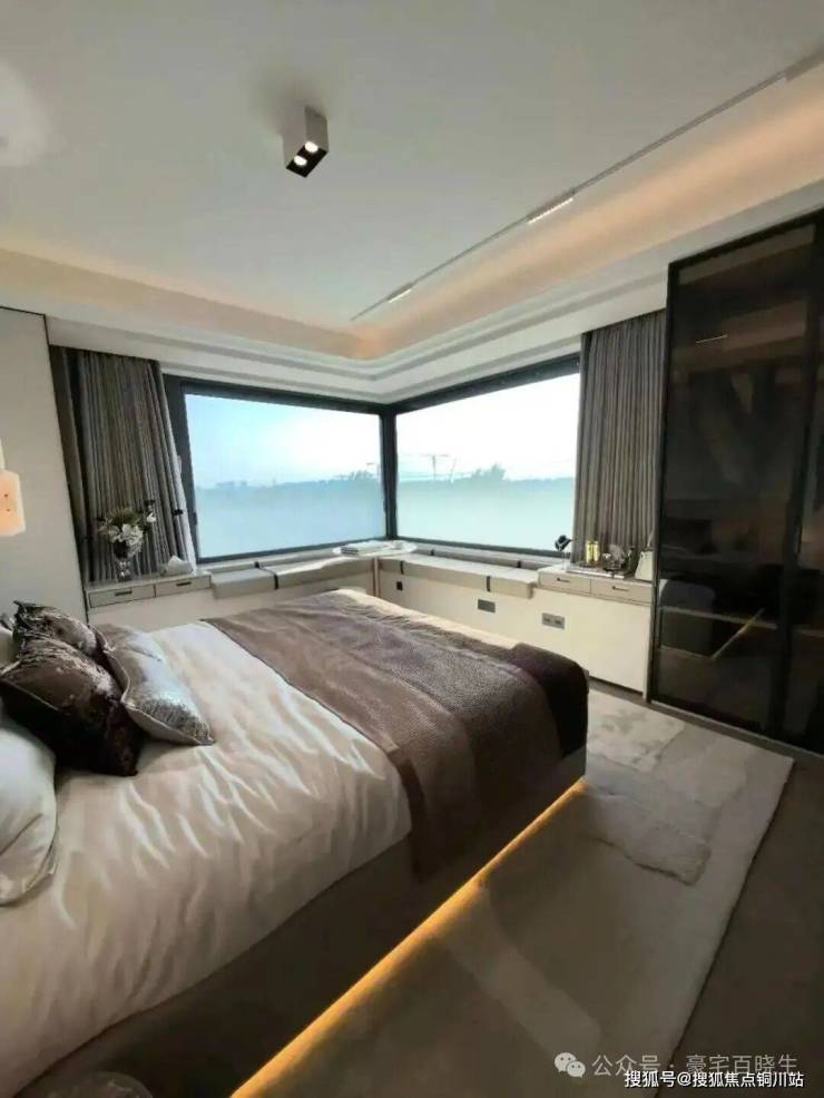 卧室也使用了转角飘窗,可以在飘窗上打储物柜,提高收纳功能。