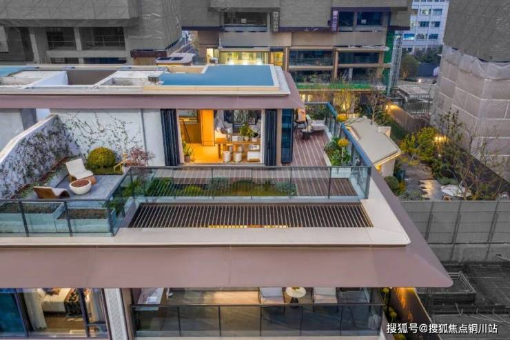 又如下叠“气场全开”的私家庭院——奢阔的空间尺度足以媲美合院级别,不仅是南向的超大院子,甚至北面与侧面,也有院落空间互相打通,形成270°环绕式庭院。