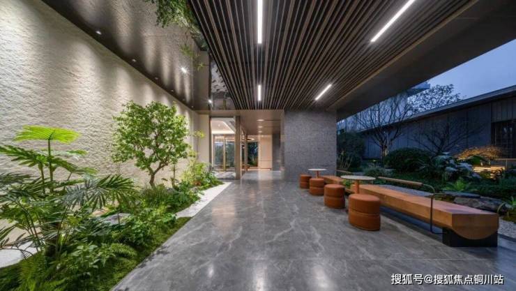 正式进入示范区,首先映入眼帘的,是近3000方的共享会客厅,作为三大中心花园之一,全世界甄选49种植被设计打造,层次丰富,搭配黑山石和水景,营造曲径通幽的归家之路,未来还能增加小业主对于植物的认知度。