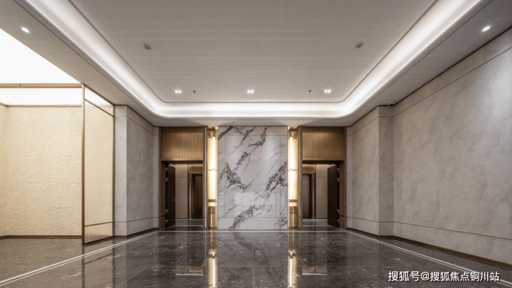来到电梯轿厢,芬迪白岩板与墙面米色皮革硬包和柔光灰茶镜的镜面造型相结合,打破了空间的封闭感,赋予了其延伸感和肌理感。扶手部分采用咖色皮革硬包进行点缀,不仅提升了舒适度,更凸显出奢华与精致的气质。