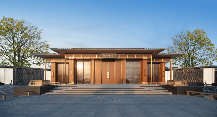 约3200㎡的超尺度入口仪式广场,「高10米、宽26米」的中式威仪府门,汲取宋徽宗笔下《瑞鹤图》宫殿建筑形制宫门屋脊,恢弘大气,创造了启东罕有的归家门庭礼序。