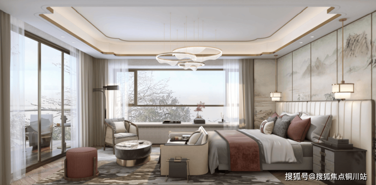 主卧配上全屏落地窗观湖视野非常清晰灵动,270°转角凸窗让主人躺在浴缸也可观湖,非常惬意!超大空间可设计家庭影院,书房等,私密且舒适。
