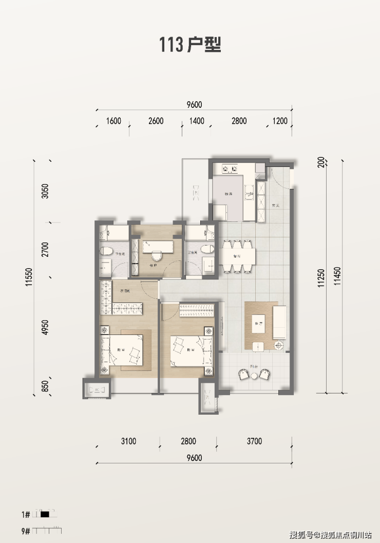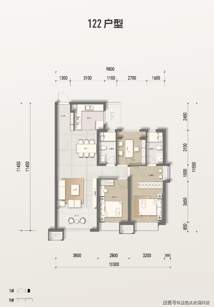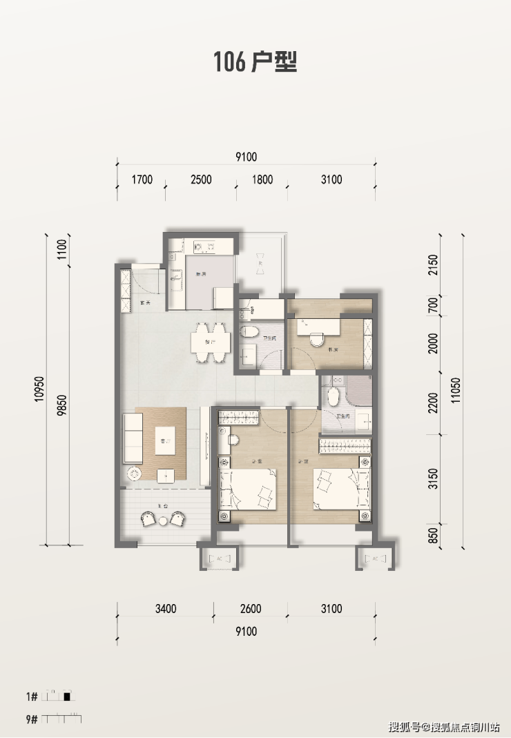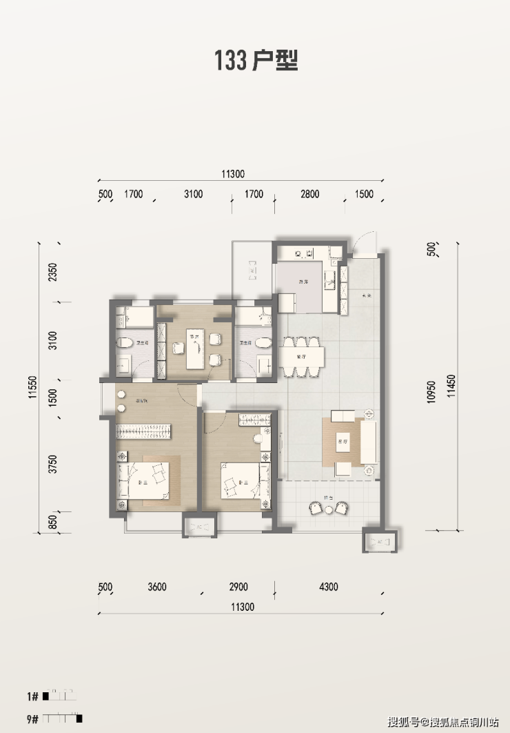 目前主推1#和9#两栋楼,户型面积从106平方米至133平方米不等,涵盖三室两厅两卫的经典格局。