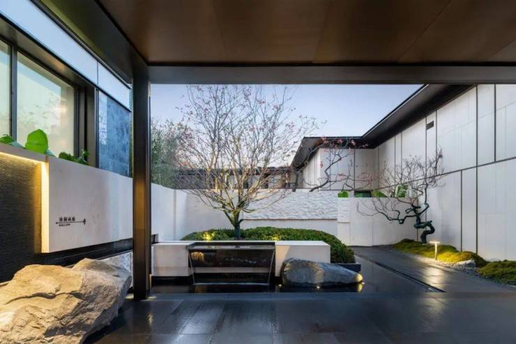 扇门内的合院中央,龙之第八子“蚣蝮”盘卧在 “曲水流觞”水台之上,护佑一方平安,而一侧框景“松山连翠”下汩汩泉水勾勒出了山石拙朴之下的细腻婉转。