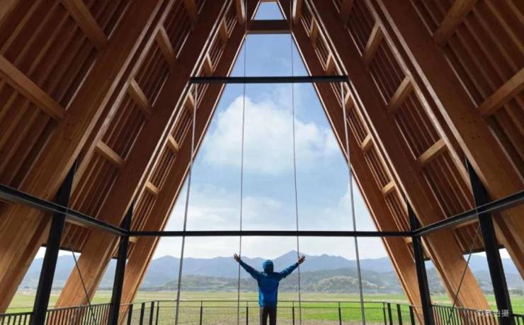 就像海边的阿那亚一样,这座文艺小镇的精神地标是一座礼堂。这座木结构的建筑,悬于千亩田野之上,建筑空间完全开放,看微风吹拂着稻浪,可以眺望可以冥想。耳畔响起许巍的民谣小调:生活不止眼前的苟且,还有诗和远方的田野;或是周董那首《稻香》。