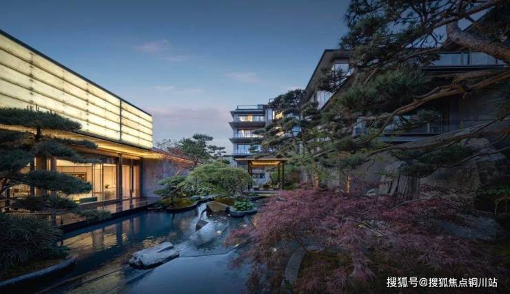 绿城·逸庐延展地块红线外的转角公园,打造约500m²的山水归家前场。由多块中国黑老石皮整石雕琢形成的飞虹瀑,视线的焦点形成了山水叠瀑之象。