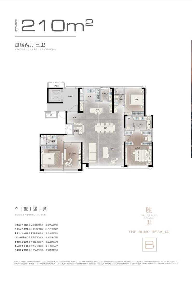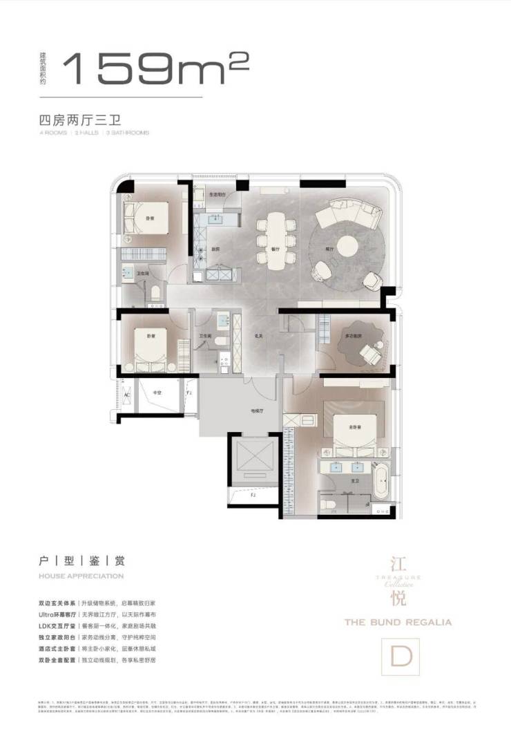 ⑤作为准四代住宅,综合使用率高达约95%-103%,户型设计瞰江面宽阔,建面约244㎡户型Ultra版环幕江景全景舱客厅,三面观江,且四个卧室均能观江。建面约198㎡户型同样三面瞰江。