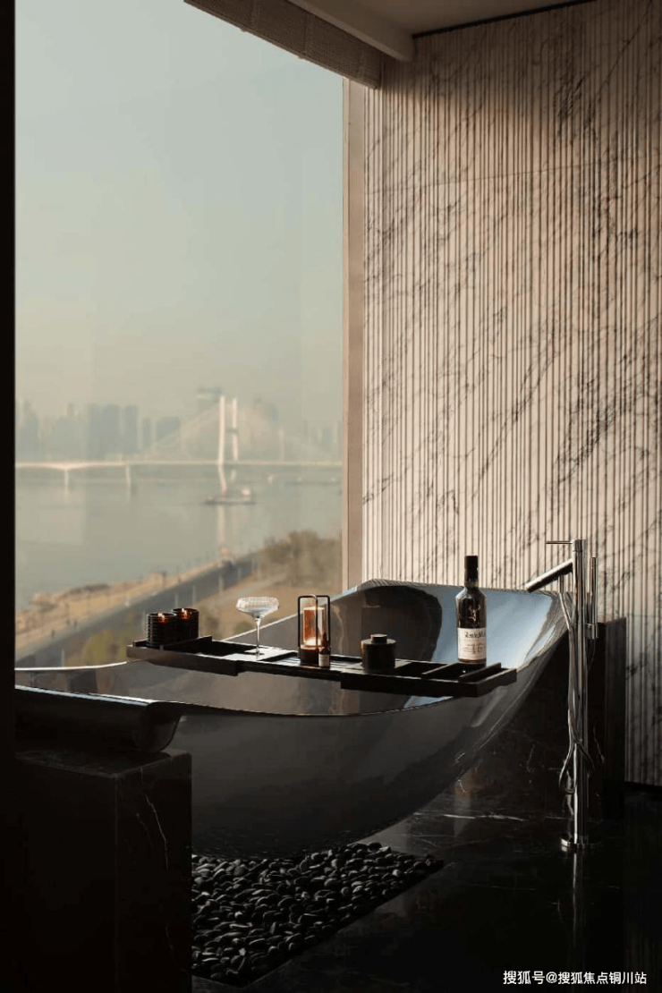 立面为全玻璃幕墙,辅以灰色层间铝板线条及香槟色浪花造型,写意江面星星点点的波光效果,打造立面层次感,增加精致度,同时结合近3米长转角圆弧的宽幅玻璃幕墙,形成室内外无界场景,揽江入室。