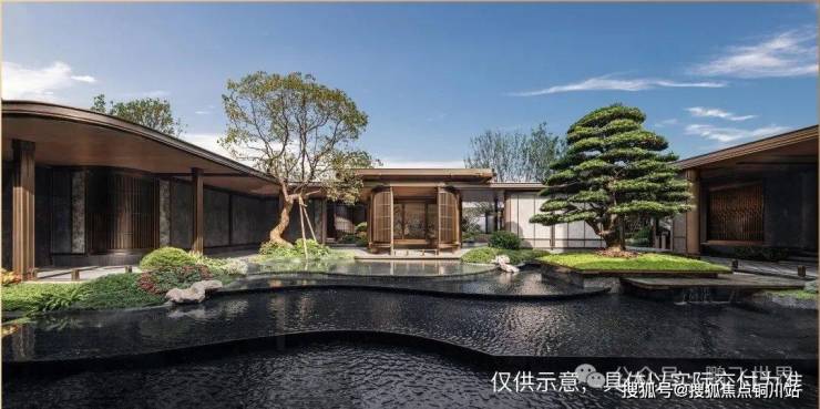 三进式园林以《桃源问津图》为蓝本,通过镜面水景、罗汉松阵列与鱼鳞纹景墙的虚实交织,在都市核心区复刻出“移步异景”的古典游园体验。