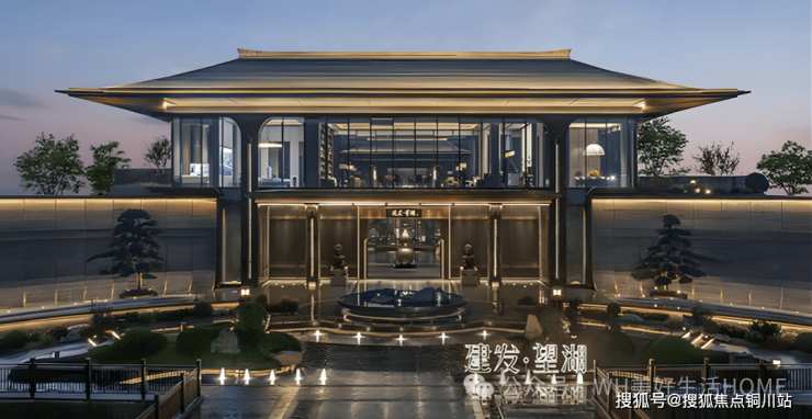 项目大门以《瑞鹤图》为灵感,取意宋徽宗笔下的祥瑞景象。近83米巨幅中式府门,屋顶形制承袭自中国传统建筑至高规格【庑殿顶】,将世家威仪大气横陈。每每归家,一路踏云纹石材,赏苍翠名松,过守门铜狮,穿垂麟铜门,尽显尊贵礼序。