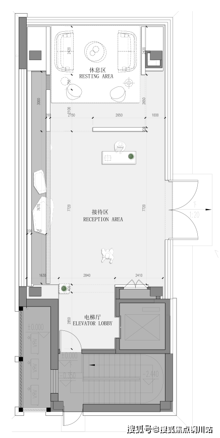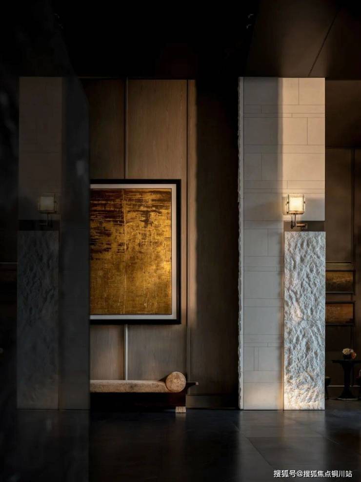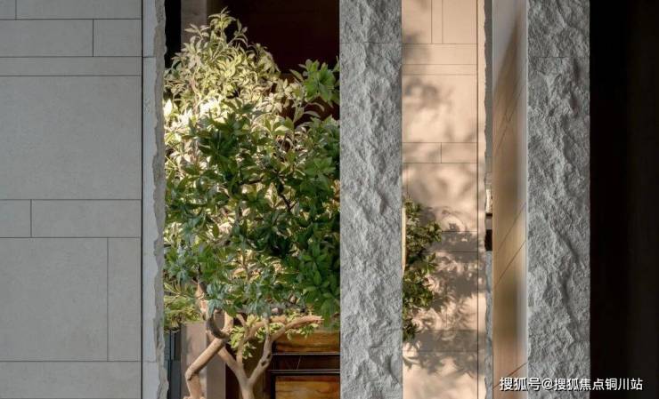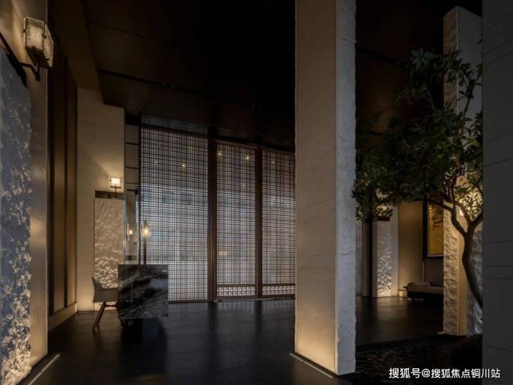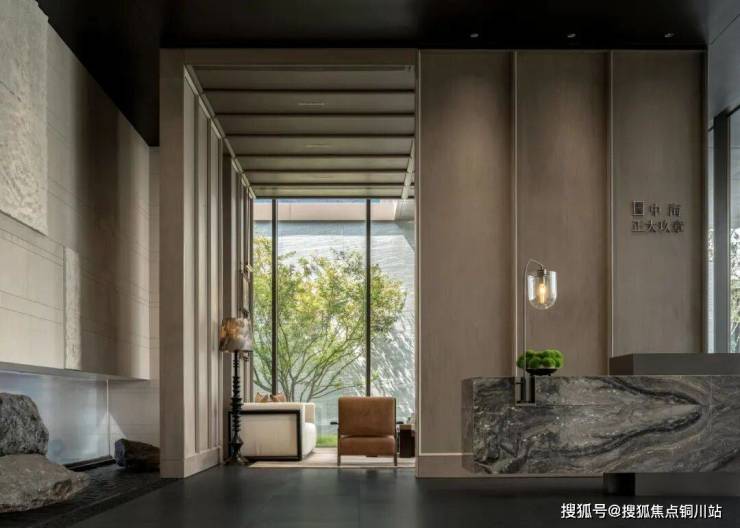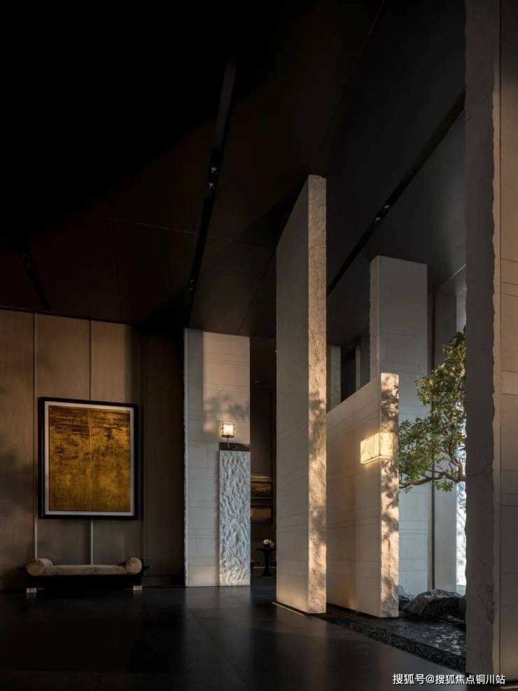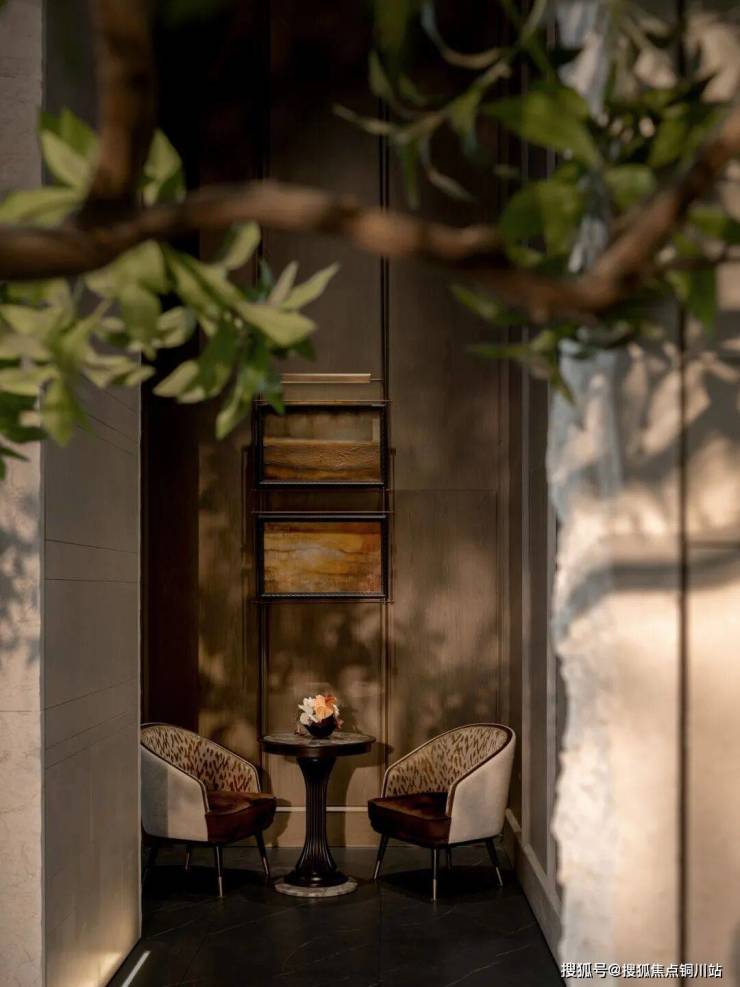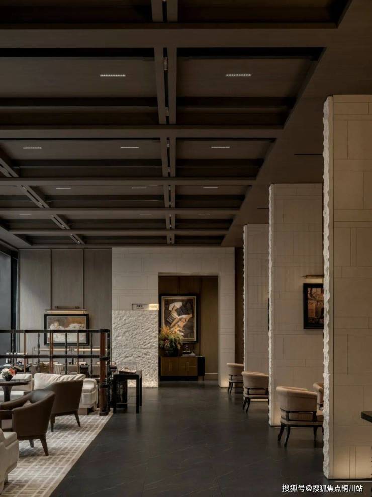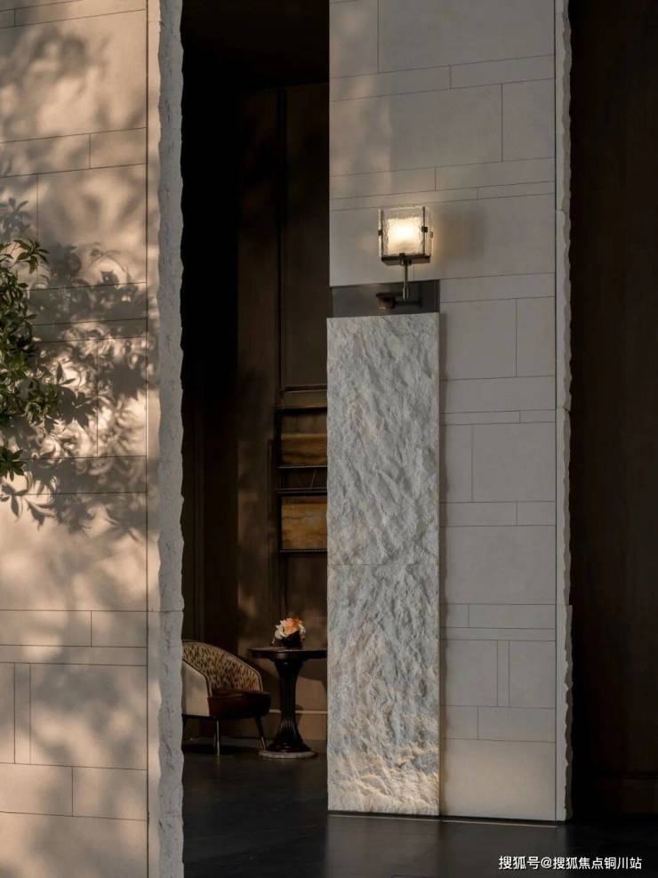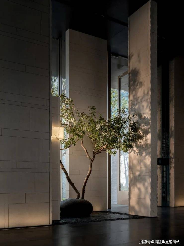 接待大堂延续了社区大堂的设计语言,正对面设置了一道悬浮式景墙,其下方采用透空设计,将室外景致“框景入境”,形成内外交融的生态对话。自然光影由由天井洒入室内,勾勒出空间的细腻层次与温度。