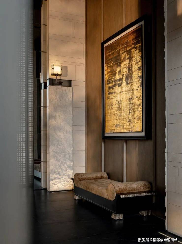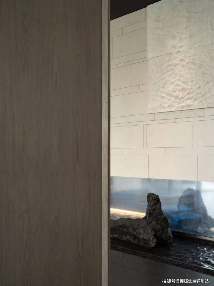 墙面上米白色大理石自然面的粗犷犹如时光之中被风化的痕迹,又似太行山脉的原生脉络,带着未经雕琢的野性之美与哑面的温和质感形成鲜明对比,通过精准的材料分割与几何构成,勾勒出丰富的光影层次。这种材质间的对话,最终诠释出设计对自然美学的独特感知与品味。
