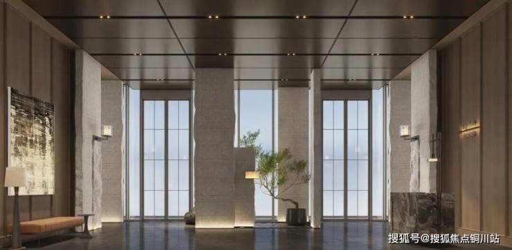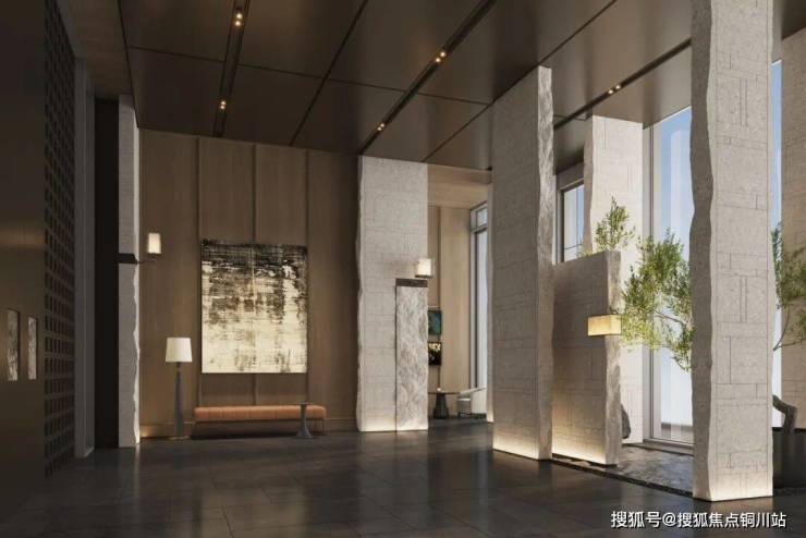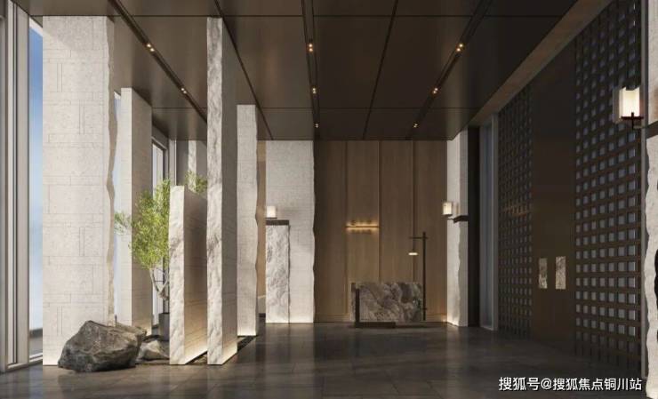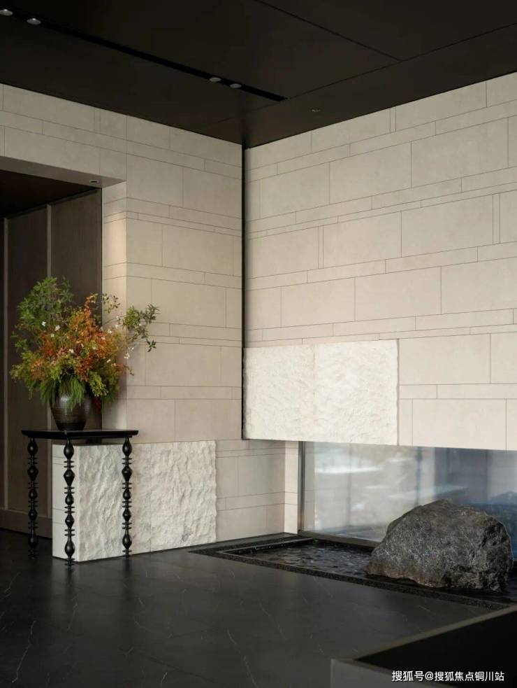 社区大堂位于首层迎宾位置。米色大理石立墙有序排布于空间之中,通过体块的穿插、切割与叠合清晰地界定出功能区域,并围合出一方静谧且富有张力的室内场域。点缀其间的绿植与景石,与石材的原生质感形成对话,共同营造出一处微缩盆景般的自然情境。