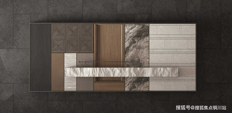 再以同一的材料体系与造型语言协调三个功能区,建立起连贯的视觉秩序,强化空间的整体性:选择深色主调,搭配灰色系与图案肌理。天花与地面以均质的深色材质奠定基调,墙面通过中性木饰面与浅米色大理石形成视觉过渡。局部的香格里拉灰大理石以其恢弘的天然纹理,进一步强化空间沉稳而磅礴的氛围。整体格调稳重而优雅,具有奢华酒店的风度。