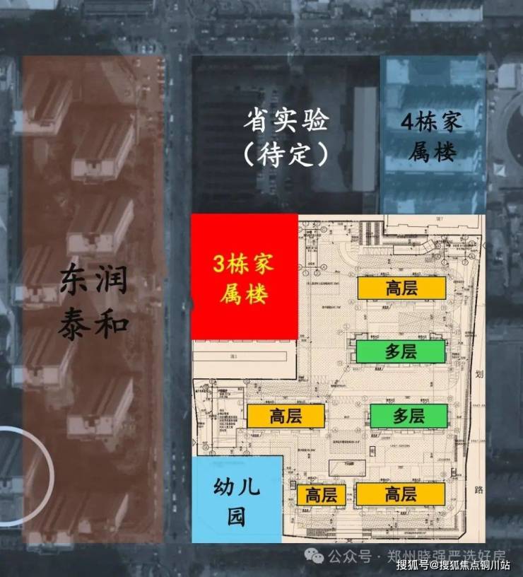 首先,看中海峯境叁號院如何以高低配的教科书式设计,直击金水主城的改善市场,峯境叁號院的总占地是48亩,容积率2.49,绿地率35.01%,建筑密度19.95%,总共规划了4排2列6栋楼,而且是4栋高层、2栋洋房的高低配混搭式教科书设计,除北侧6号楼与洋房楼间距23米可能影响低区采光外,其余3栋高层因周边均为低矮老房子,外侧无遮挡,中高楼层全天采光无忧,只不过视野虽然开阔但难享社区景观。