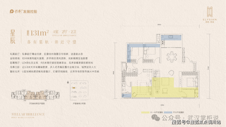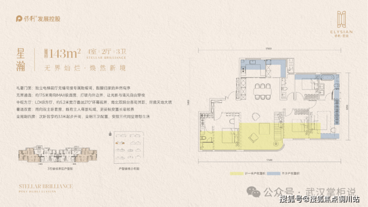 建面约143㎡四房,南向双套房设计,约17.5米南向面宽,LDKB方厅+270°环幕视野,亮点非常多。