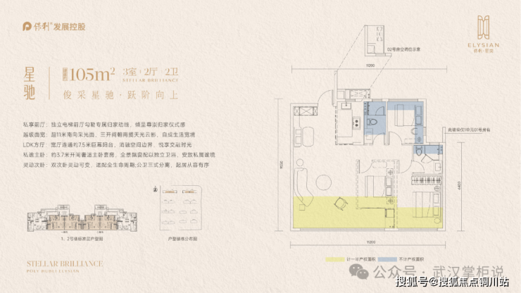 建面约105㎡三房两厅两卫,享独立电梯前室,约11.2米奢阔南向面宽,优化空间也非常多。