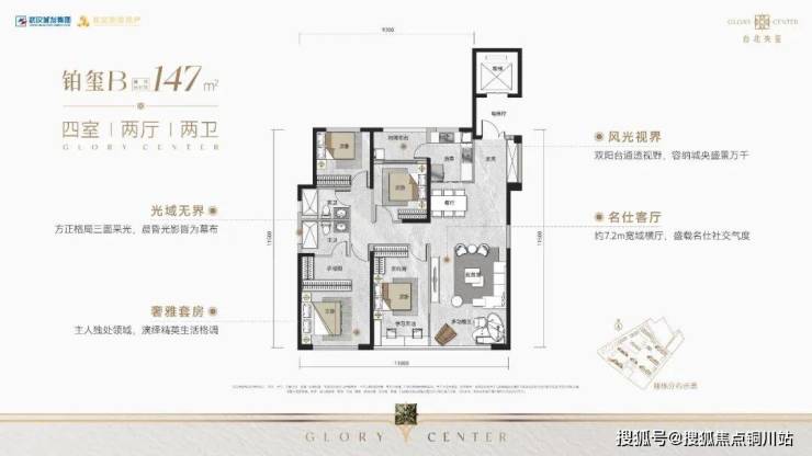 建面约147㎡户型,可以保留约7.2米宽厅,将来家里人口增加,也可以改造出四房格局。