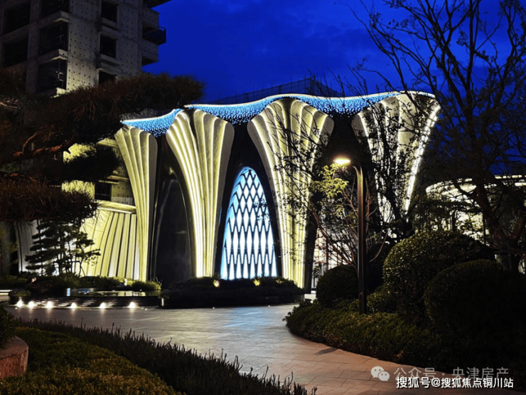 门庭中间采用顶级彩釉玻璃与蚀刻金属板交织,定制花瓣肌理与生长纹路暗藏其中,让归家之路成为一场视觉盛宴。