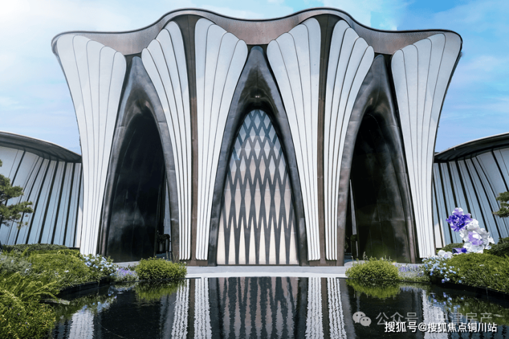12米高UHPC花瓣造型,以工业级三维建模与纯手工锻造模具精雕曲面,国内首例无缝巨尺度艺术大门,诠释流动的生态韵律。