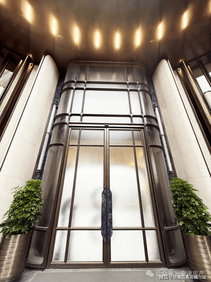 8米通高古铜金属内衬玻璃门,水纹柔化金属质感,四水归堂檐口以现代手法重构东方聚宝盆寓意,雨帘垂落间,财韵与艺术共生。