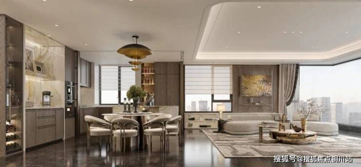 在空间布局上,5.8 米开间的方厅堪称设计亮点。其以“用横厅的尺寸配置竖厅格局”的巧思,让尺度感拉满——客厅与餐厅自然融合,打破传统空间壁垒,既满足家庭聚餐时的热闹氛围,又可灵活划分互动区域,孩子玩耍、长辈休憩、主人待客互不干扰。