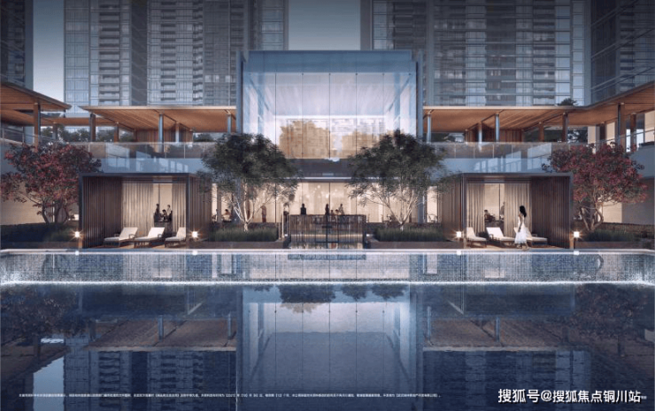 其中一个重要景点便是城心河谷下沉式泳池。泳池旁设有度假式休憩躺椅、男女更衣盥洗室、健身房、瑜伽室、商务会客空间等功能区,为业主营造出在城心体验五星级酒店度假式归家的奢适空间。