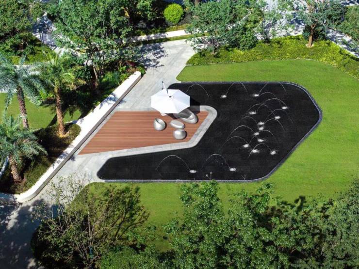 再进而来到灵动跳泉区域,开阔的观赏草坪加上愉悦的喷泉水景,在舒适的木平台造就一片悦享休闲之地。南侧的森林户外影院与儿童活动提供户外活动休闲的空间,在这里享受自然、增加亲子互动、满足亲子交流与儿童交友成长。