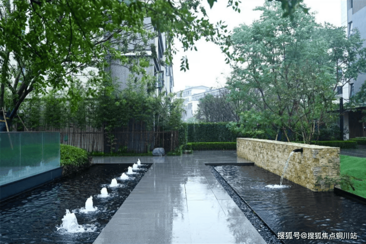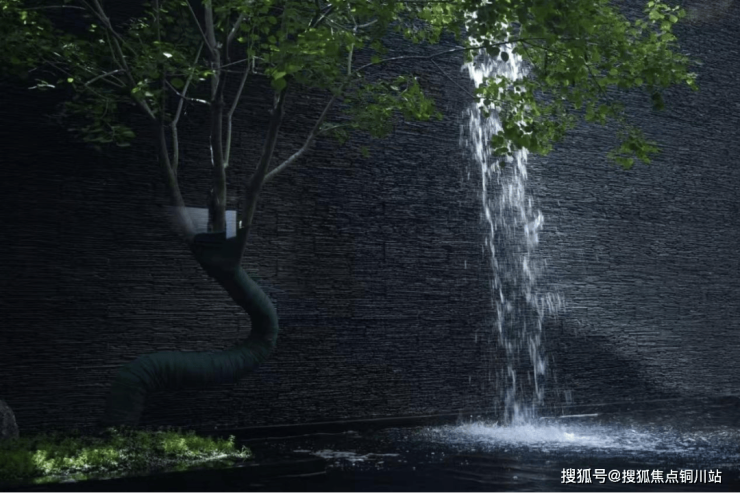 穿过风雨连廊,在庭院式归家大堂内聆听约5米高叠瀑叮咚,让人卸去了一身疲惫。