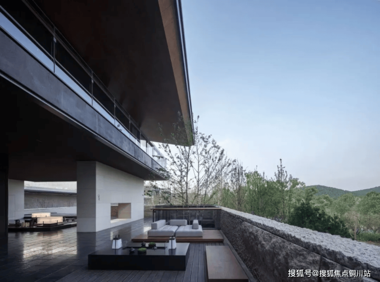 入口进来,则是由约600㎡无雨归家连廊构筑的“山林雅院”,厚重的景墙与自然美景相得益彰。