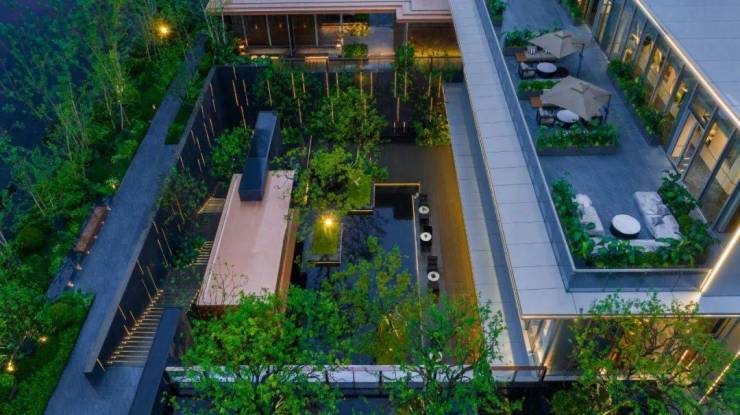 玖映蠡湖打造了无锡罕见的沉浸式会客区——约600㎡下沉式庭院+二楼星空露台+悬浮茶室,与风雨连廊相望,打造林下休憩空间、叠瀑造景和禅意茶室等景观节点。