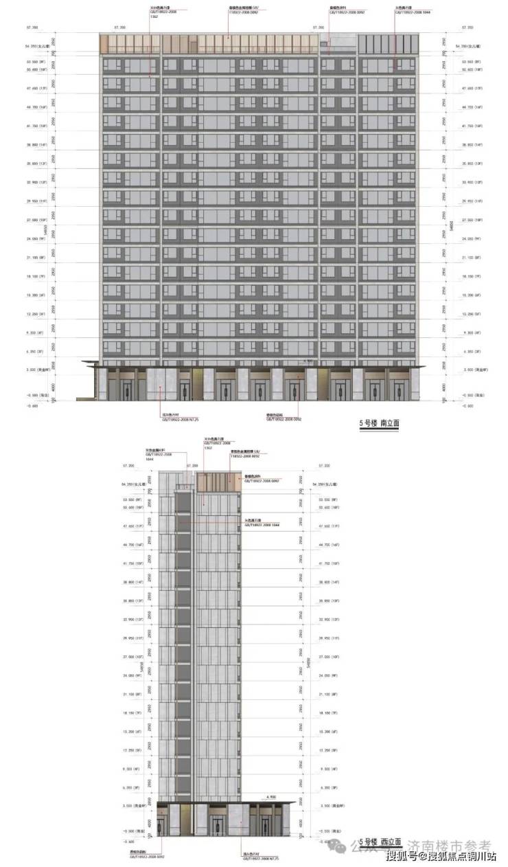 外立面一层是香槟色铝板+浅灰色石材;标准层是灰色、米白色真石漆和香槟色涂料;顶层有香槟色金属格栅造型。