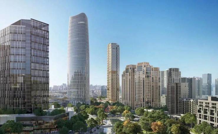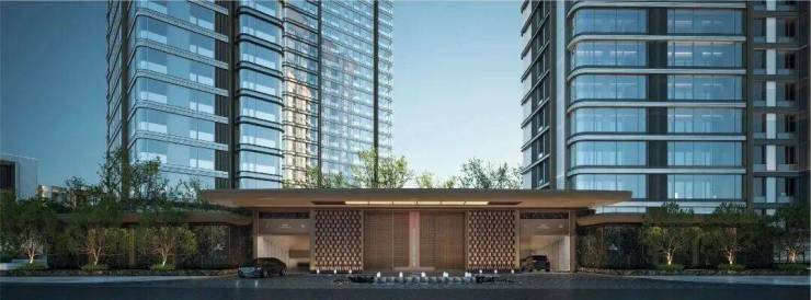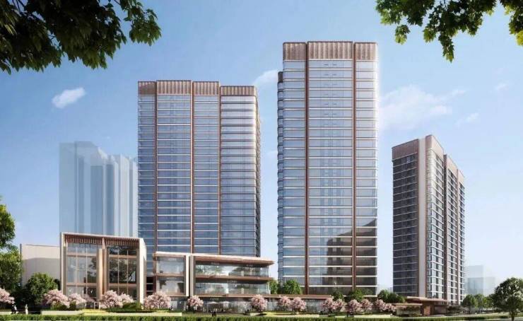 项目的建筑立面是非常有辨识度的,整体采用“鎏金冠冕”公建化设计,造型灵感来源于黄鹤楼的飞檐和长江的风帆。
